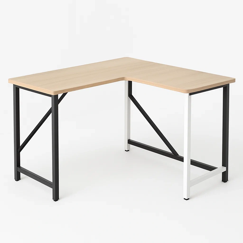 Questa scrivania angolare a forma di L presenta un piano in legno composito e una struttura in metallo verniciato.