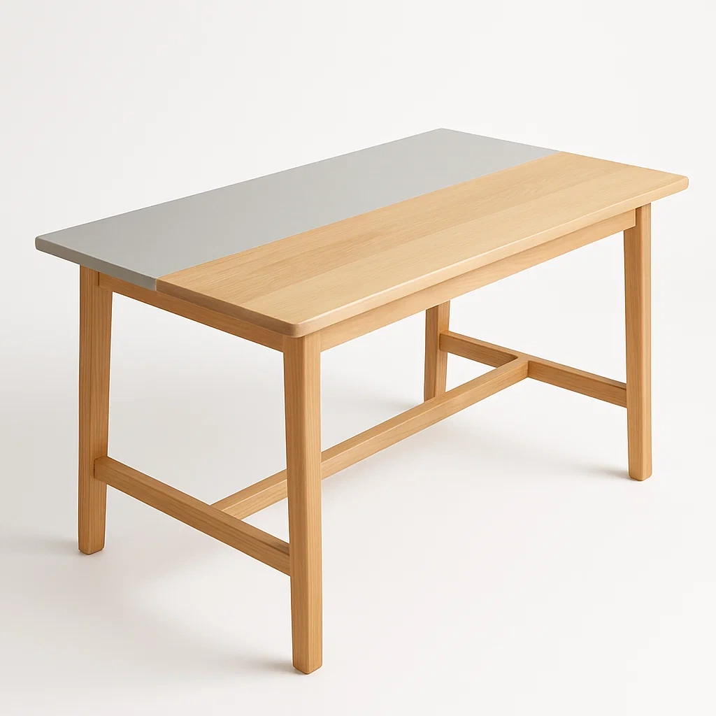 Questo tavolo da pranzo presenta un design rettangolare con un piano bicolore composto da una parte in legno chiaro e una in laminato grigio.