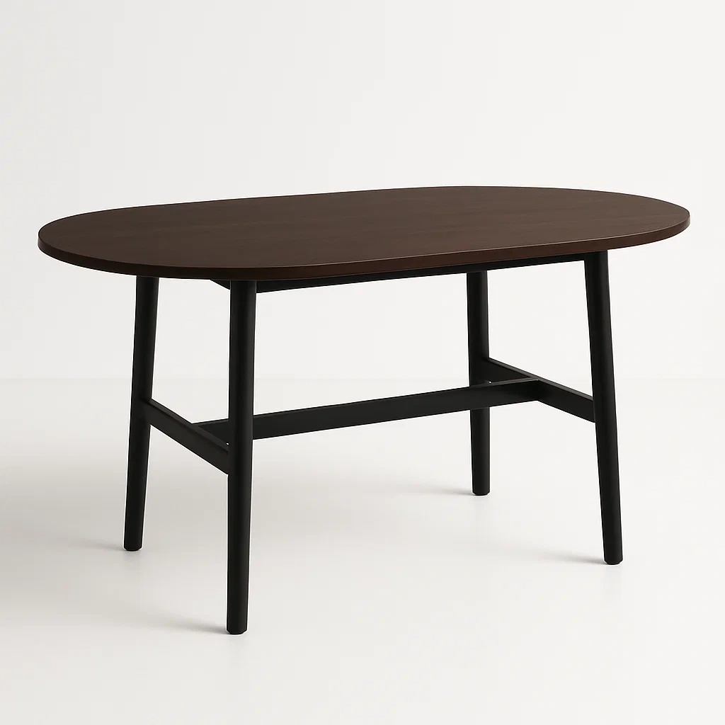 Questo tavolo da pranzo ovale ha un piano in legno di colore marrone con gambe in metallo verniciato nero.