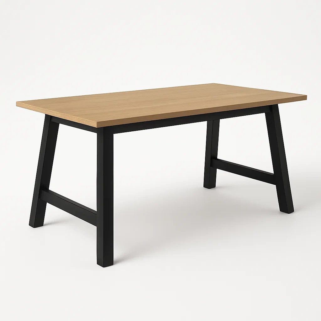 Il tavolo presenta un piano in legno impiallacciato con gambe in metallo verniciato nero.