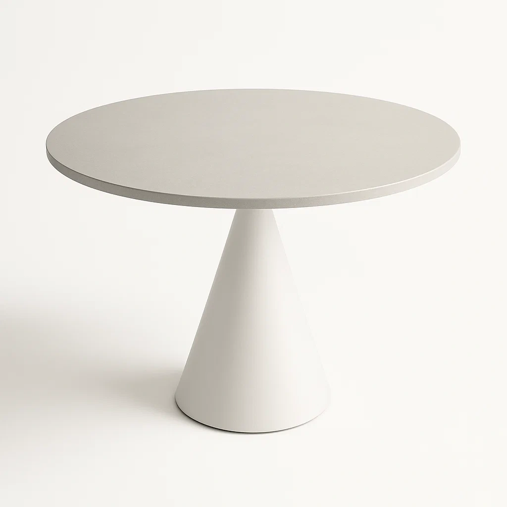 Il tavolo presenta un piano in legno laccato grigio e una base conica con finitura laccata bianca.